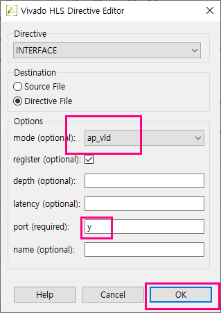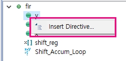 Source에서 fir.c를 더블 클릭하면 오른쪽에 Directive 탭에 저렇게 port들이 나옵니다.