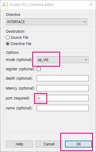 x와 y는 valid pin이 존재하도록 해야해서 mode를 ap_vld 로 선택하였습니다.